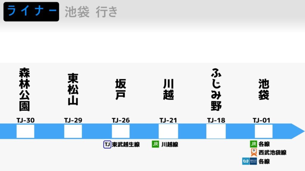 また、TJライナーの下りの27号、29号は森林公園どまりとなっていています。