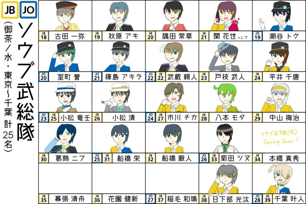 今月より、総武線の駅を擬人化したやつを本格的に始めました。外にお出しできる情報はまだ少ないですが、「ソウブ武総隊」の46名がお送りするカオスな暴走寸劇にご期待ください。